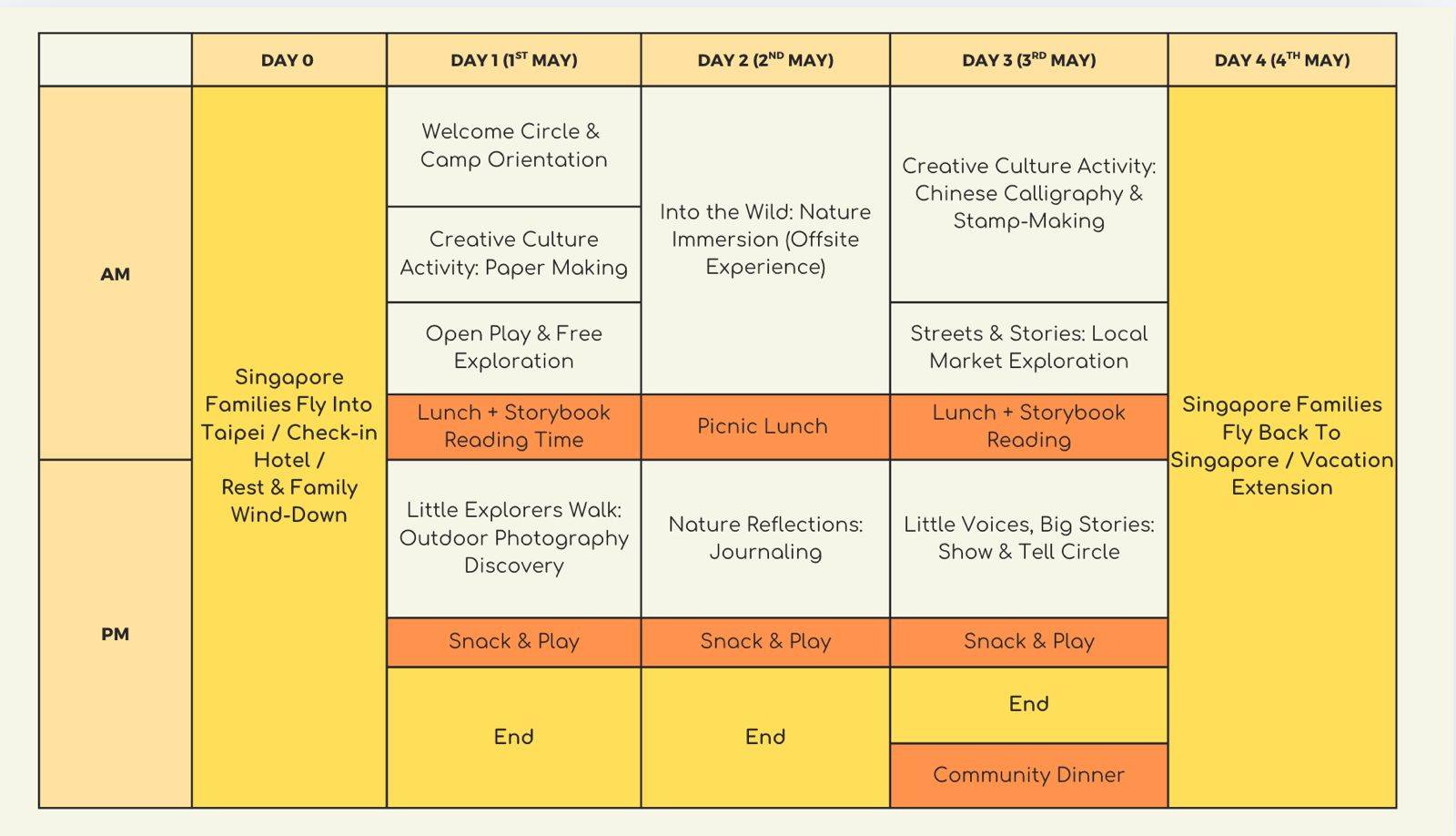 Package Type: Self-guided package. This gives you the ultimate flexibility and cost-effectiveness when you decide where you want to stay, how you want to get around, where to eat and where to explore. The price you pay is for the camp only. Need help in planning? We will provide families with a recommendation list to assist in the planning.