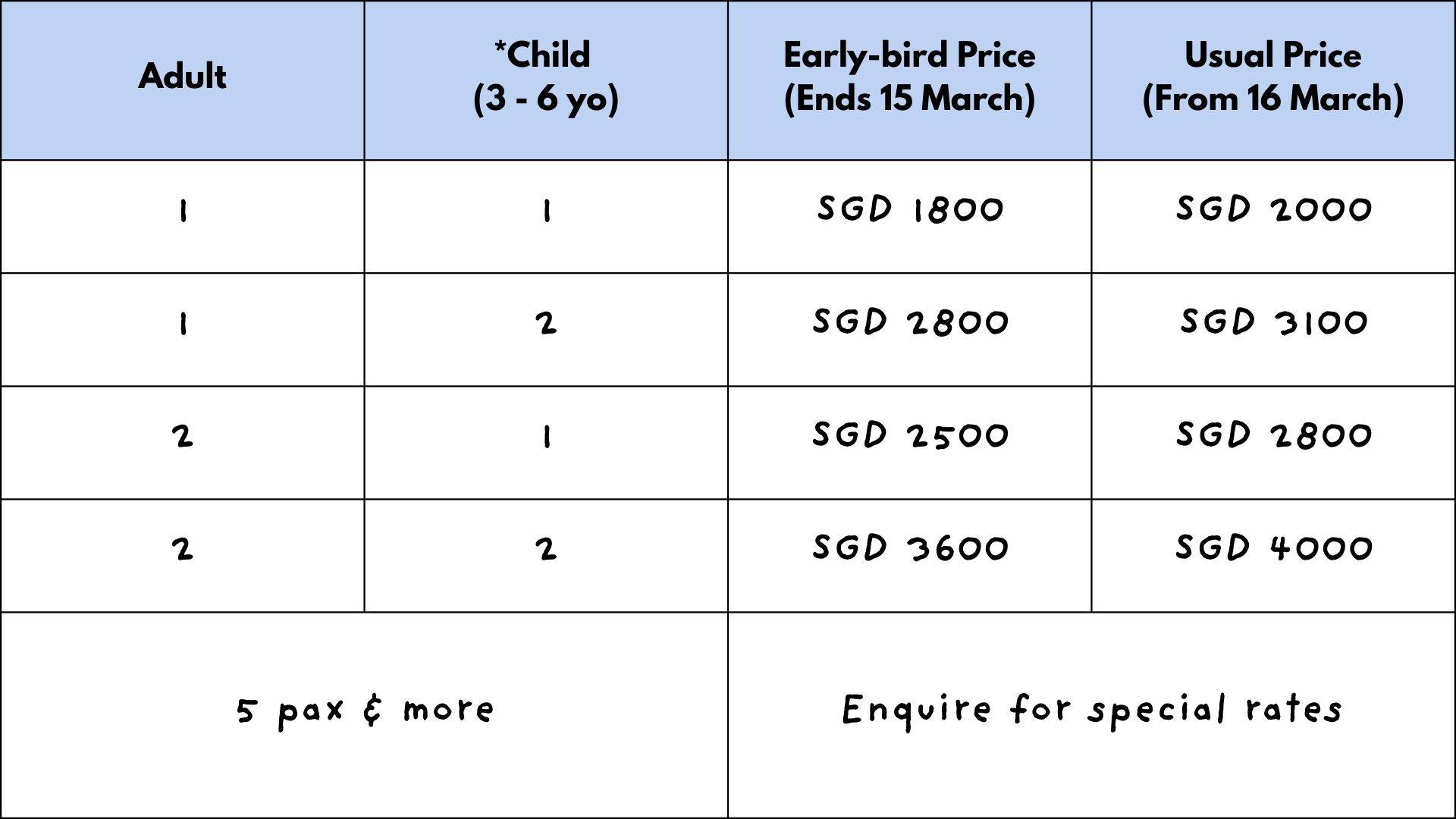 Full payments are required upon sign up. Fees are via bank transfer, paid to a Singapore bank account. Cancellation policy applies.